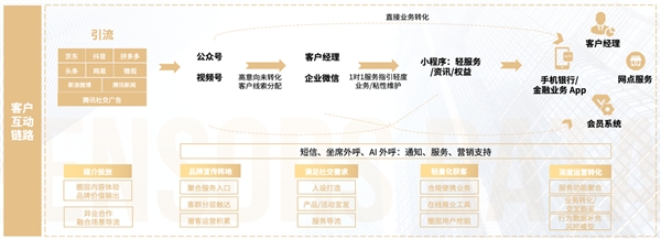 金融企业在客户全链路互动与经营上,涉及到的渠道触点也比较多。通常,在引流阶段,客户通过交易型 App、资讯类 App、种草媒体等进行互动,之后进入公众号、视频号为主的公私域转换的形态,如果转化周期较长,还会通过客户经理和企业微信进行 1V1 服务引导和关系维护,还可以直接导量到小程序或 H5 进行轻转化,以及到手机银行、金融业务 App,结合客户经理、网点服务和会员系统加强后链路深度运营。