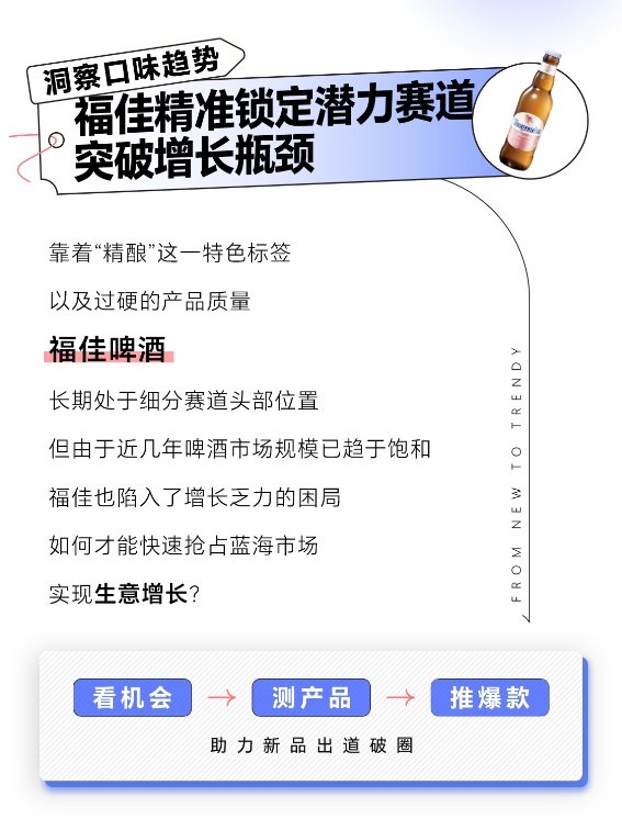 福佳啤酒在巨量云图“新品推爆”全能力的加持下,通过商品多维度洞察快速了解市场趋势,并利用「新品实验室」进行敏捷、准确地测品,有效降低上新试错成本,精准定位潜力货品、高价值人群以及营销场景,在实现短期生意增量爆发的同时,也为品牌在抖音平台长效经营累积了人群资产。