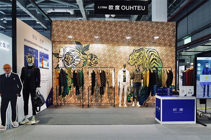 除了注重客户体验,现场服装陈列搭配及展馆搭建也很有讲究。展厅内,第三代OT原创图案与前Gucci设计师Paola Smania的“虎嗅蔷薇”联名印花,交相辉映,彰显着欧度品牌的风格与调性。墙面上老花、猛虎、花卉几大元素浑然天成,带来强烈的视觉艺术美感。左侧墙面还展出了《欧度与清华大学艺术与科学研究中心色彩研究所》有关中国男装色彩研究的合作报告。