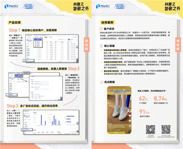 本期的「科普之答案之书」正是以服饰行业的新品上市营销节点为例,品牌结合“数据工厂”中的“标签工厂”“建模预测”等能力,通过“一锁定、二扩展、三提效”的经营策略,在双十一大促节点准确找到了新品核心用户和潜在消费者,同时配合品牌动态创意优化,保证在大促期间的投放规模和投放效率,最终实现了CTR与ROI的大幅度提升。