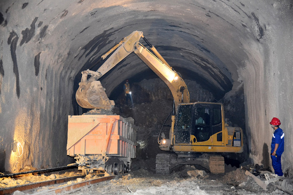 滇中引水工程建设全面提速。图为5月30日,中国中铁五局的建设者在滇中引水工程昆呈隧洞9号支洞内施工。新华社记者 林碧锋 摄