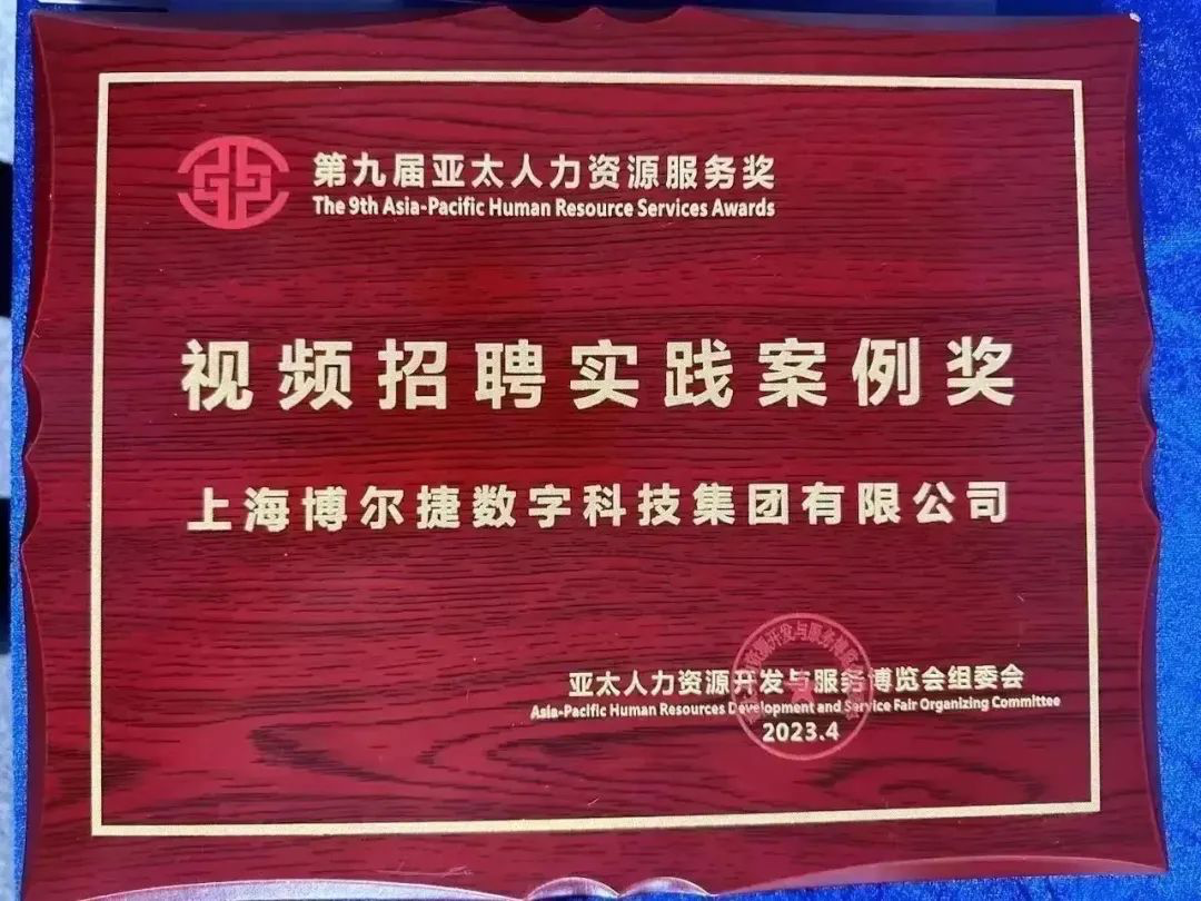 在颁奖仪式上,博尔捷数字科技集团一揽第九届亚太人力资源服务奖两项大奖:数字化应用奖和最佳实践案例-视频实践案例奖。