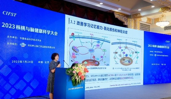 浙江农林大学食品与健康学院院长闵伟红作题为“核桃活性肽改善学习记忆力的分子机制及应用”报告。她介绍说,核桃中蛋白含量10%以上,具有未知的一级序列结构以及β-折叠和无规则卷曲的二级结构,是潜在的具有多功能、高活力的新肽原料。而核桃活性肽作为食源性功能因子,是应用于功能性食品或药物治疗的理想物质之一。