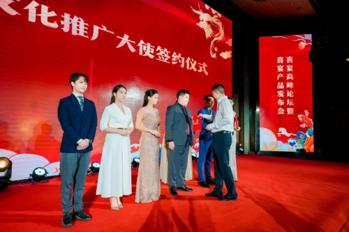 在发布会期间,小角楼与多方合力,不断拓展“喜事喜宴喜酒”的多维引领覆盖面,更与河南广播电视台主持团队“六六大顺主持团”正式签约,将宴会气氛推向高潮。