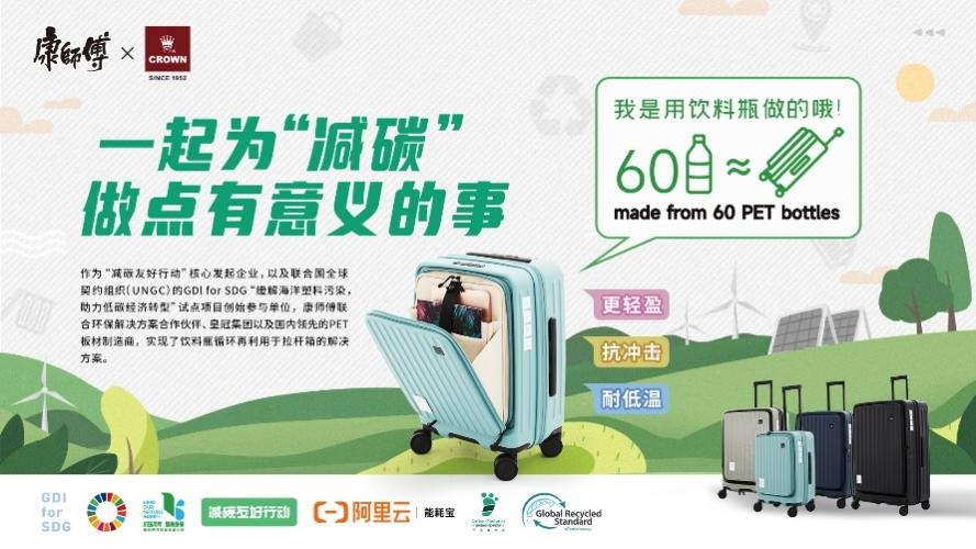康师傅还作为主要发起单位之一携手联合国全球契约组织(UNGC)共同发起了GDI for SDG(全球发展倡议助力可持续发展目标)的首个试点项目——“缓解海洋塑料污染,助力低碳经济转型”,与合作伙伴一道将回收的PET等使用后塑料制品,再造为多种生活消费品,又通过电商平台的销售推广,实现循环利用。在前不久的世界地球日,康师傅与环保解决方案合作伙伴共创,实现了用康师傅废弃饮料瓶制作拉杆箱、野餐垫、收纳盒等环保周边产品。其中联合旅行箱品牌CROWN皇冠,共同推出环保旅行箱,也是在电商很受追捧,成为第一个商业化的rPET项目。由于应用了专利技术,旅行箱使用的回收塑料量大,比现有材料更环保,而且品质更好,无异味,更耐冲击,耐低温。这个项目实现了从塑料循环利用到商业价值链的良性循环,让业界看到循环经济模式的曙光。