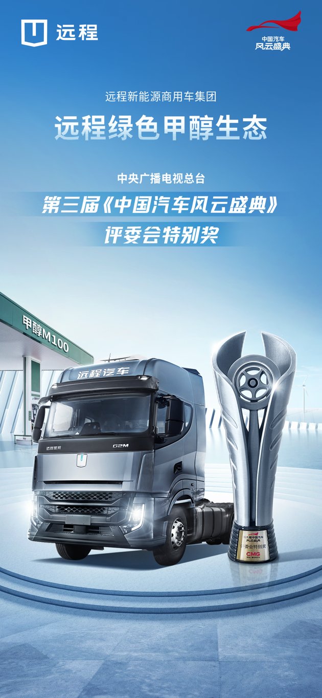 2023年4月7日,在中央广播电视总台主办的第三届《中国汽车风云盛典》颁奖典礼上,远程绿色甲醇生态荣获评委会特别奖,成为首个以商用车为主体的获奖企业。