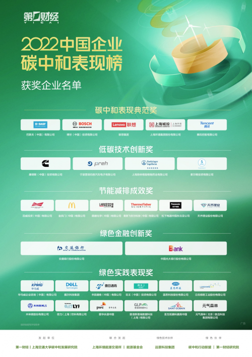 2023年4月22日下午,首届中国企业碳中和表现榜颁奖盛典在上海隆重举行,29家在碳中和进程中表现出色的企业,分获5大奖项。