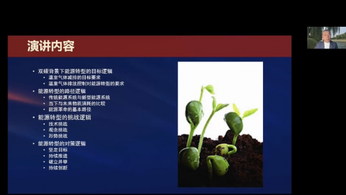 中国能源研究会常务理事、红杉中国投资合伙人李俊峰通过视频演讲的形式,从双碳背景下能源转型的目标逻辑、路径逻辑、挑战逻辑、对策逻辑等多个方面着手,分析了《能源绿色转型的逻辑》。