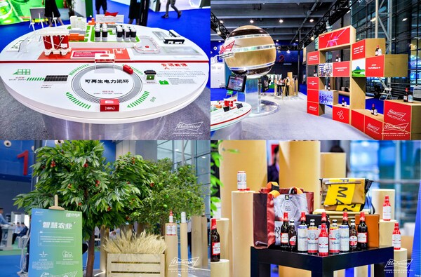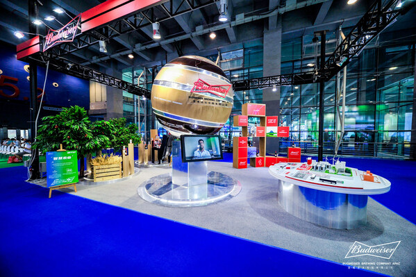 百威作为可持续发展的先行者,本次展台遵循绿色低碳的设计理念,采用更具可持续性的材料分展区展示百威在ESG策略、绿色生产和绿色物流、水资源管理、智慧农业、循环包装等方面的丰硕成果。其中地球形状的循环装置采用了由百威啤酒糟回收制作而成的植物基皮革、环保纸等可回收再生的包装材料,整体布局风格充分体现了"绿动未来"的参展主题特色。一直以来,百威将可持续发展理念贯穿业务始终,凭借极具前瞻性的战略目标,配合强大的本土执行能力,在本届盛会交出了一份亮眼的绿色发展"成绩单",吸引众多嘉宾观众驻足参观交流。