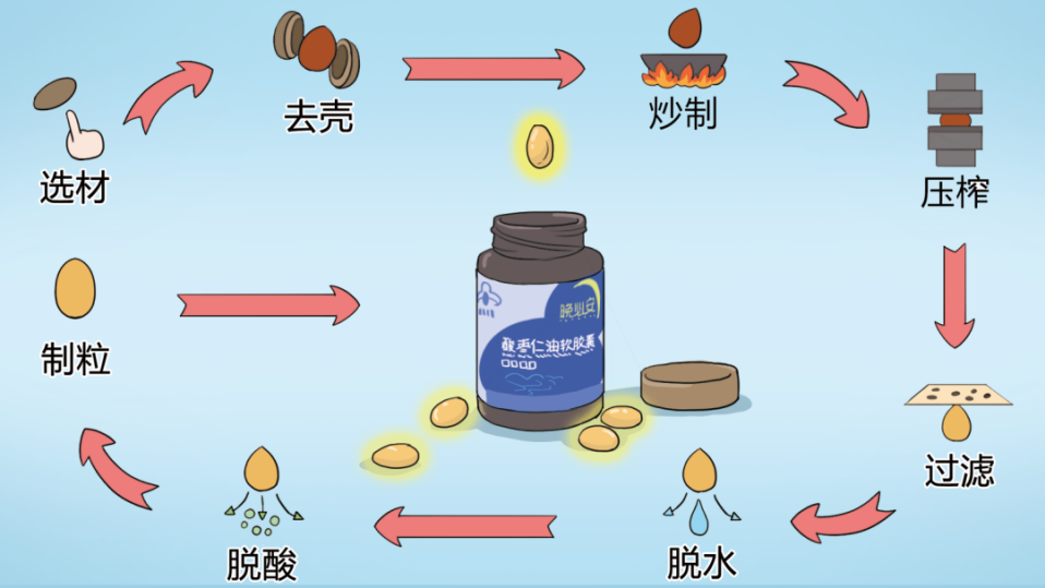 晚必安酸枣仁油软胶囊就采用了这一工艺,低温榨取,千倍浓缩,一千斤酸枣仁仅能得一斤油,最大程度保留了有效助眠成分。