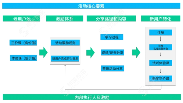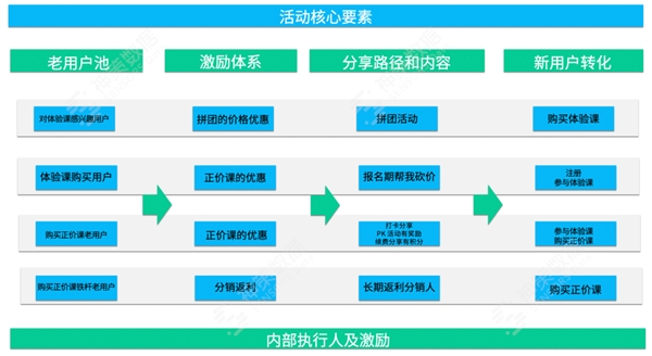 老用户池:活动设计时,我们首先需要问自己,活动主要面向哪些用户,这些用户有什么特征,他们是否愿意进行分享,分享的触点应该埋在哪儿,他们对哪些奖励是感兴趣的,他们拉来新用户转化的难度如何,目标怎么设计。很明显,面向购买正价课的老用户和注册用户的活动肯定是有差异的。