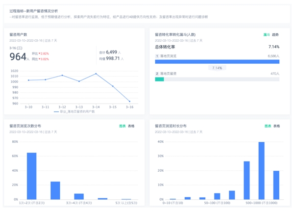 留咨率代表用户浏览留咨页面后留咨的比例,我们可以直观判断效果如何。若留咨率较低,可以将浏览留咨页面但没有留咨的用户创建一个分群单独分析。其分析维度通常有三个:留咨页面浏览次数分布、留咨页面浏览时长、留咨页面触达深度。