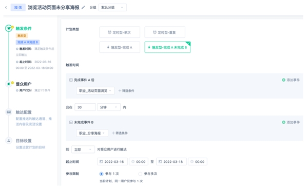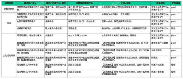 我们梳理了三种运营场景,对于未参与过转介绍活动的用户可以促其首次使用;对于之前参与过但近期未参与的用户进行促活;对于完成阶段性目标的老用户进行触达提醒,来优化活动的效果,如下表所示: