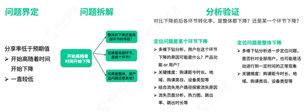 首先,判断该问题是整体的问题还是局部的问题。整体的问题一般是什么原因导致的呢?如节假日影响、版本发布、产品 BUG、政策因素等,然后通过对比分享转化漏斗各环节转化率在下降时间点前后是否一直下降。整体的问题一般影响面较大,通过核心维度下钻可以定位,比如 Android/iOS,或是时间周期。一般情况下更多的是某个环节出现问题。定位到具体环节后,再看是产品问题还是用户层面问题。另外,从运营视角,可以去确认是全部用户的问题还是局部用户的问题,这个通过核心维度下钻可得知。