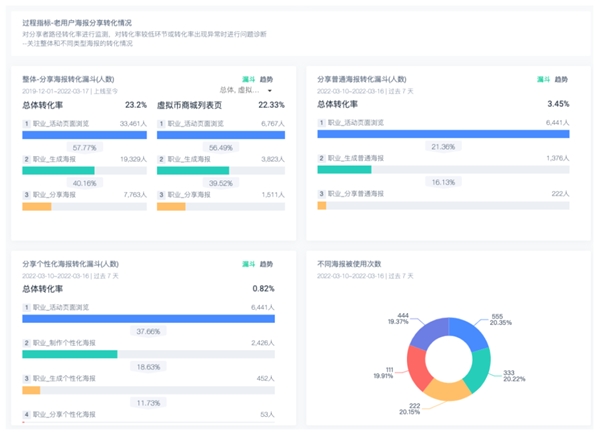 梳理老用户分享的路径,穷尽所有可能,然后在每个节点进行埋点,带上关键属性。老用户分享路径的优化目标主要是对分享率进行监测,低于预期值进行探索分析,给产品进行 A/B 测试提供方向性支持或用户运营提供策略方向,并在转化率出现异常时进行问题诊断。