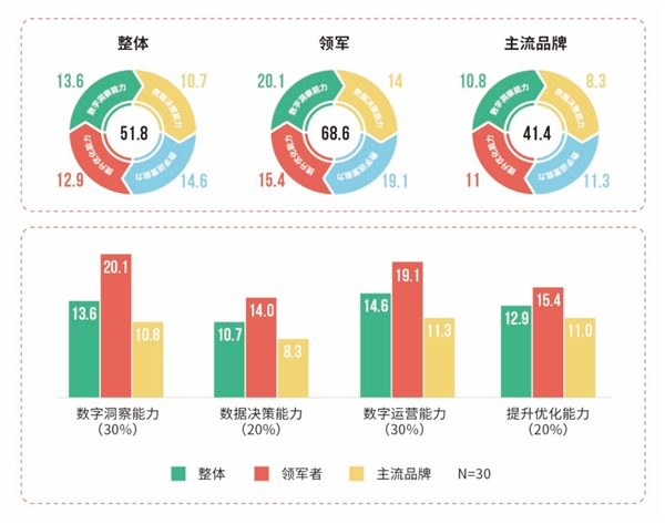 根据神策数据对新国货美妆品牌数字化运营成熟度评估的指标解读发现:国货美妆整体数字化营销能力处于中游水平,各领域均有较大提升空间;领军者在模型各方面均较领先,其中【数字洞察能力】和【数字运营能力】是关键;主流品牌的数字化营销能力还偏弱,主要体现在【数字洞察能力】上的建设力度不够。