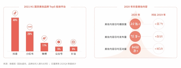 第一,新国货美妆品牌拥抱新的投放渠道,抖音成半数品牌线上投放的选择。