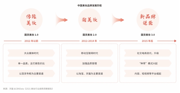 伴随着大众媒体、移动互联网、社交电商的发展与升级,中国美妆品牌经历了“传统美妆→淘美妆→新品牌逆袭”的过程。目前,国货美妆已经迎来 3.0 时期,依托社交电商占领消费者心智。