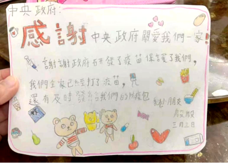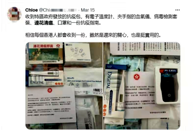 “收到特区政府发放的抗疫包,有电子温度计、夹手指的血氧仪、病毒检测套装、连花清瘟胶囊、口罩和一份抗疫指南,挺实用的。”近日,一名居家隔离的香港居民收到政府派发的“抗疫物资包”后,在社交平台开心的晒出图文。更早前,一位叫殷殷的香港小朋友用自己手写的感谢信,表达了对中央政府为香港市民提供防疫物资的感谢。随着疫情防控的逐步深入,一个个像这样满载关爱的“抗疫包”越来越快地出现在人们手中。