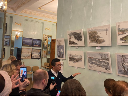 开幕当天,画家刘子舆受邀走进俄罗斯国家科学院“大师课堂”,教授俄罗斯学员创作中国水墨画。学员不少是俄罗斯知名的专业油画家。刘子舆从画面构图、运笔、调墨、调色等方面进行深入讲解,现场示范中国绘画技巧,墨色在宣纸上产生浓淡变化,学员们很惊喜,非常感谢刘子舆带领他们体验了东方艺术之美。