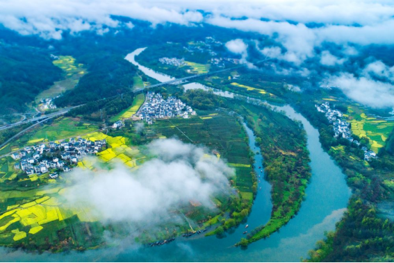 青和绿,代表着春天和希望。汪口的一弯春水比天空还要明净,乘着竹筏顺江而下,和着潺潺溪流聆听春天的脚步。这一刻两岸青绿山河成了永恒。青绿千载,山河无垠。