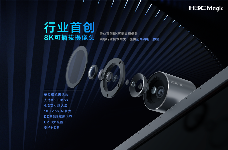 值得关注的是,行业首创的8K可插拔摄像头,采用远超传统会议一体机和手机芯片的4/3英寸超大尺寸感光传感器,搭配无畸变非球面玻璃镜头与f/2.0大光圈,配备10Tops AI算力和DDR5超高速的内存,并且能够支持8K 30fps与HDR功能,敏锐捕捉光源信息变化的同时快速反馈完成视觉成像,保证了超高清的视讯体验,灵动捕捉每一帧超真感视效。同时,摄像头能够支持即插即用功能,为高敏感行业的隐私诉求提供了更好地选择,最大限度保障用户信息安全。