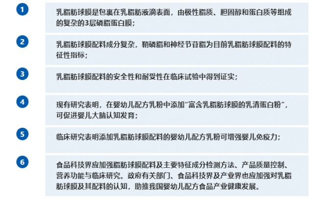 专家组参考自1965年至2022年期间的相关文献,通过专题讨论形式,达成了6项共识性观点和建议,其中包括乳脂肪球膜配料的安全性和耐受性在临床试验中得到证实;现有研究表明添加乳脂肪球膜配料及磷脂的婴幼儿配方乳粉可促进婴儿大脑认知发育;临床研究表明添加乳脂肪球膜配料的婴幼儿配方乳粉可增强婴儿免疫力;食品科技界应加强乳脂肪球膜配料及主要特征成分检测方法、产品质量控制、营养功能与临床研究。政府部门、食品科技界及产业界也应加强对乳脂肪球膜及其配料的认知,助推我国婴幼儿配方食品产业健康发展等。