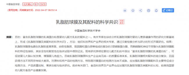4月7日,《中国食品学报》刊发中国食品学界刚刚取得的一个突破性科学共识成果——中国工程院院士、中国农业大学营养与健康研究院院长任发政等近20位中国食品科学技术学会权威专家形成了国内首个《乳脂肪球膜及其配料的科学共识》(以下简称“乳脂肪球膜科学共识”),共识明确指出,婴幼儿配方乳粉添加“富含乳脂肪球膜的乳清蛋白粉”后可促进婴儿大脑认知发育、增强婴儿免疫力。