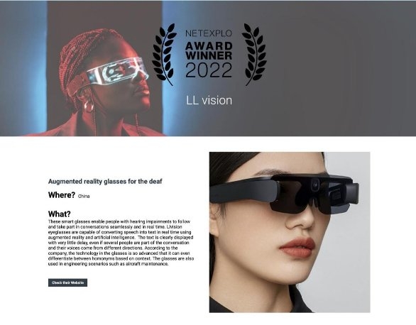 值得关注的是,在今年的评选中,亮亮视野智能AR字幕眼镜成为唯一入选该奖的中国代表,也是AR领域的唯一代表。在活动期间Netexplo论坛官网面向全球观众进行了一个投票活动,从10项创新中选出年度最佳创新成果,亮亮视野智能AR字幕眼镜脱颖而出,与第一名票数极其接近,获得第二名,彰显了大众对它的肯定和期待。