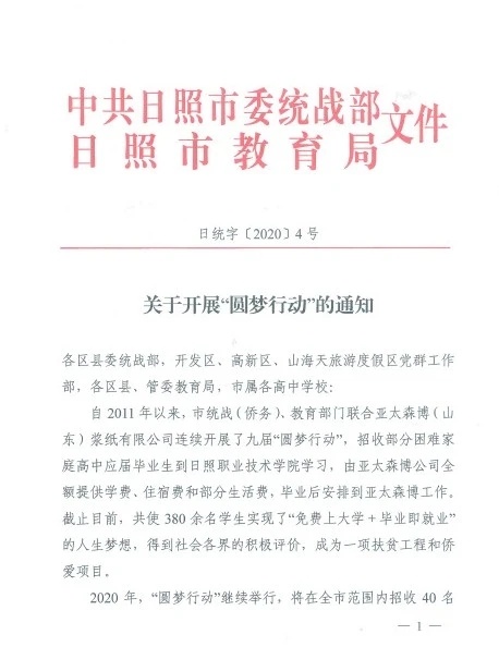 2011年,亚太森博与统战部门合作开展的“圆梦行动”正式启动。亚太森博出资,统战协调教育部门出政策,与大学合作,为考上大学的家庭贫困高中生解决学费、生活费,圆梦大学。