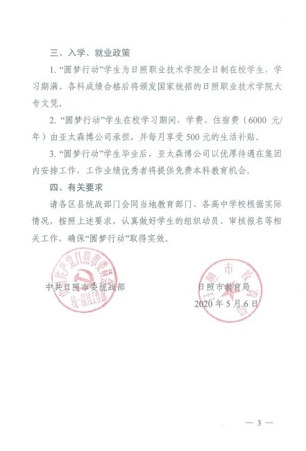“到今年,亚太森博‘圆梦行动’已持续开展了十一年,企业投入了1400多万元,惠及了包括归侨侨眷在内的441个家庭,更通过这441个家庭带动他们的大家庭,实现了‘助学、筑梦、铸人’的初心。这是一项实实在在的惠民工程、侨爱工程,成为侨资企业教育扶贫、智力扶贫、就业扶贫的典范,得到了中央统战部、中国侨联等肯定。”日照市委统战部副部长、市侨办主任刘海诚说。