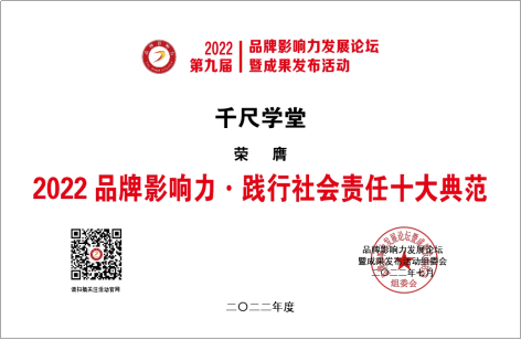 近日,由《发现品牌》栏目组、对外经济贸易大学中国国际品牌战略研究中心、《中国企业报》集团主办的2022品牌影响力发展论坛暨成果发布活动正式举办。活动以“大力发展品牌战略促进经济高质量发展”为主题。围绕中国品牌创建行动,培育新型消费,实施领航企业培育工程,促进专精特新小巨人企业培育等内容展开分析探讨。在着重推介具有优秀成长性或影响力的品牌环节中,千尺学堂荣膺“2022品牌影响力·十大新锐企业”、“2022品牌影响力·践行社会责任十大典范”两项大奖。