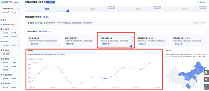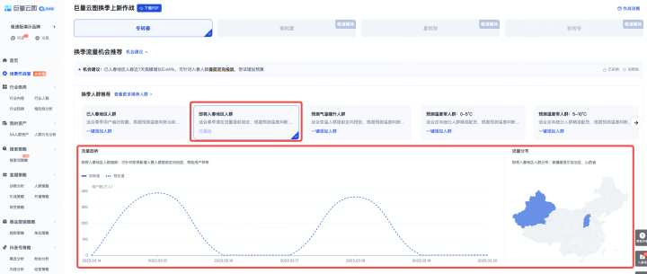 查看“已入春地区人群”或“即将入春地区人群”的流量趋势,提前预知未来7天的入春人群规模,根据流量变化找到合适的换款时机。
