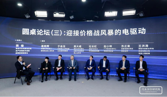 在电动汽车电驱动系统全产业链技术创新战略联盟理事长贡俊的主持下,中国科学院电工研究所主任、研究员温旭辉,北京理工大学机械与车辆学院教授于会龙,清华大学车辆与运载学院副教授、博士生导师高大威,深蓝汽车动力开发部副总经理杜长虹,广汽埃安研发中心电驱系统总监赵小坤,极狐电驱动项目研发总师苏正杲,博格华纳联合传动系统有限公司电驱工程经理王洪涛等嘉宾,围绕“迎接价格战风暴的电驱动”这一主题进行了交流讨论。
