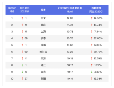 百城中55%的城市2023Q1通勤距离均有所增加,通勤距离榜TOP10城市中,九城通勤距离同比上涨,其中春、哈尔滨的同比涨幅超30%。