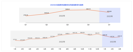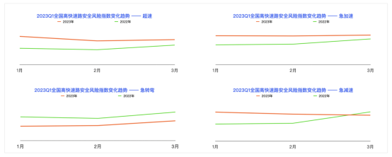 数据显示,全国高快速路的安全险指数环比2022第四季度下降8.16%,全国高快速路的危险驾驶行为(即三急一超:急加速、急减速、急转弯和超速)与2022第一季度比较,超速、急转弯的变化趋势一致,急加速、急减速则在2023年3月呈现下降向好趋势。