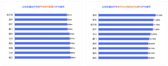 虽然哈尔滨通勤距离有所增加,但依旧是特大城市中绿色通勤指数最高的城市,沈阳紧随其后。同时,哈尔滨的公共交通出行中平均步行距离短,且步行一公里内的出行比例较高。