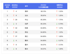 人口流动与交通的发展密不可分。同比2022第一季度,2023第一季度百城跨城迁徙规模指数都增,平均涨幅达到47.64%。最高涨幅城市为天津,涨幅达139.67%;北京、?安以涨幅116.20%、100.63%位居涨幅榜第二、第三。