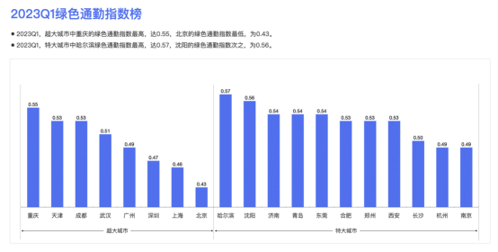 百度地图联合清华大学数据科学研究院交通大数据研究中心、北京交通发展研究院等发布的《2023年第一季度中国城市交通报告》(以下简称《报告》)显示,今年一季度,全国主要城市交通出行活力复苏,百城中近八成城市通勤高峰交通拥堵指数较2022年同期有所上升;周末游热度明显,前十名城市有八个为一线和新一线城市;通勤幸福感方面,近八成城市的1小时通勤指数超过90%,5公里通勤指数榜TOP10城市广东入围8城;重庆和哈尔滨分别是超大及特大城市绿色通勤指数榜第一。