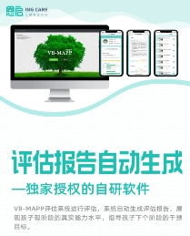 评估环节 评估报告自动生成!使用独家授权的自研软件——VB-MAPP评估系统进行评估,系统自动生成评估报告,展现孩子现阶段的真实能力水平,指导孩子下个阶段的干预目标。