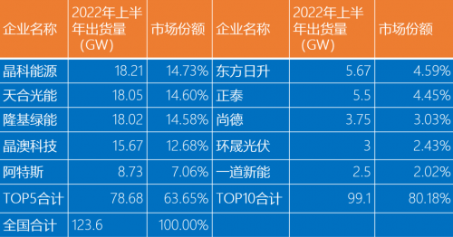 据PVInfoLink统计,今年上半年晶硅电池总产量约135.5GW。TOP5的通威股份、爱旭股份、润阳股份、中润光能、捷泰科技,总出货量约59GW,占43.54%。另有投研机构统计,TOP5出货中,通威出货约为22.5GW、爱旭出货约为17GW、润阳出货约为13GW、中宇出货约为5GW,捷泰出货约为3GW。