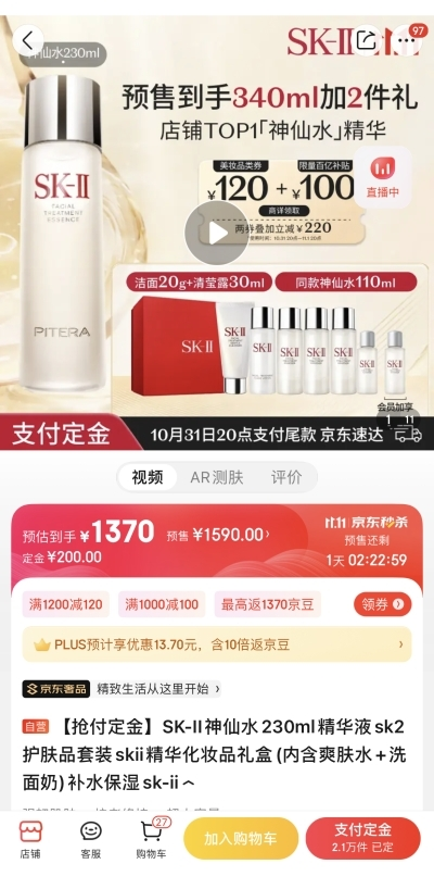 享誉全球的SK-II镇店王牌神仙水,是每个精致女孩化妆台上的必备好物。其蕴含超过90%的天然生物成分PITERA™,从根源强韧修护,显著减少秋冬肌肤干燥泛红,抑制老化因子,让肌肤更加细腻紧致、晶莹剔透。京东11.11期间,原价1590元的SK-II神仙水230ml装到手价1370元,同时加赠神仙水110ml、洁面20g、清莹露30ml,为消费者打造全流程的精致护肤体验。