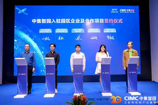 深圳市科学技术协会党组成员、副巡视员孙楠、光明区人民政府副区长彭颖、深圳市中集产城发展集团有限公司执行总裁徐凯、深圳市卫星物联网产业协会会长、中集产城副总裁张一平、绿航星际太空研究院副院长吕晓明、中集产城园区运营公司常务副总经理陈亮六位领导和嘉宾上台,共同完成中国首个卫星物联网产业园——中集智园的开园仪式。