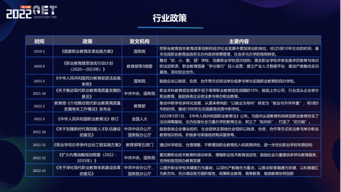 二十大报告里面对教育领域的发展也提出了明确的目标,就是要建成教育强国、科技强国、人才强国、文化强国等,尤其在教育、科技、人才方面,这都是跟我们行业息息相关的,也是我们行业机构在业务布局和企业经营方面需要重点关注的方向。