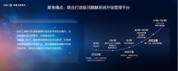 本次新品发布环节中,由工商银行和麒麟软件联手推出的“银河麒麟系统升级管理平台”引起广泛关注。该平台是首款国产服务器操作系统集约化管理平台创新产品。基于行业痛点深度打磨,拥有自动化漏洞发现与补丁安装、精细化系统配置管控两大核心功能,现已纳管超10000套银河麒麟服务器操作系统环境且稳定运行,成为业内标杆。