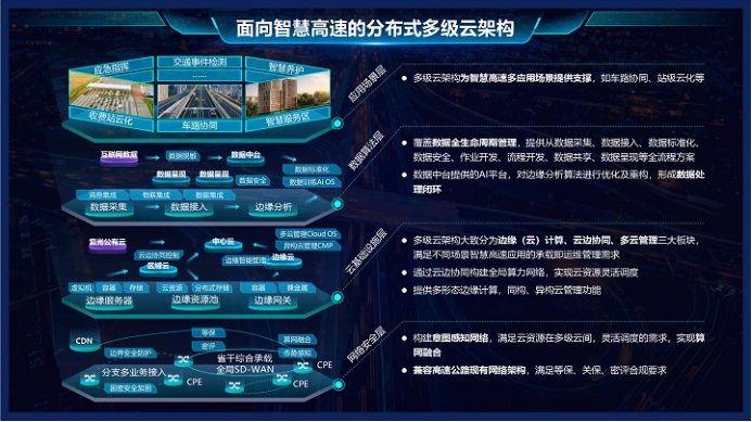 方案采用了分布式多级云架构,架构大致分为边缘(云)计算、云边协同、多云管理三大板块,通过云边协同构建全局算力网络,实现云资源灵活调度,提供多形态边缘计算,同构、异构云管理功能,为智慧高速多应用场景提供支撑。