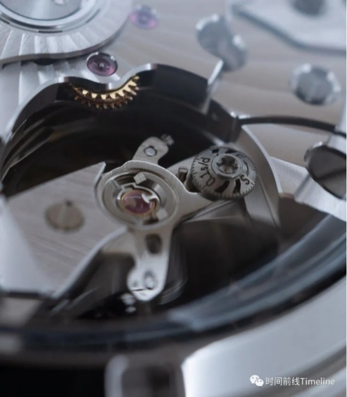 使用柱状轮,垂直离合,硅游丝,无卡度砝码微调,摆频28800次/时,动力60小时。但各位可以看到,摆轮夹板上,多了Spirate系统的调节“小圆片”。