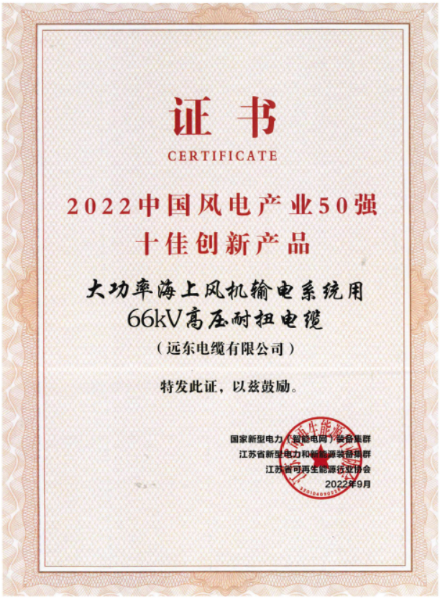该系列产品主要应用于海上大功率风电机组电力传输,不仅可以有效地提升传输容量和效率,降低系统损耗,还可以实现全寿命周期内安全可靠运行,是大功率海上风电机组亟需的核心部件,也是未来海上大功率风力发电技术发展趋势。并成功应用于华电台州玉环、福清兴化湾等多个海上风电场等项目,还被授予了国家工信部颁发的“制造业单项冠军”、2022中国风电产业50强“十佳创新产品”等多项荣誉,获得了从国家到行业的高度认可,夯实了公司在风电电缆行业的领军地位。