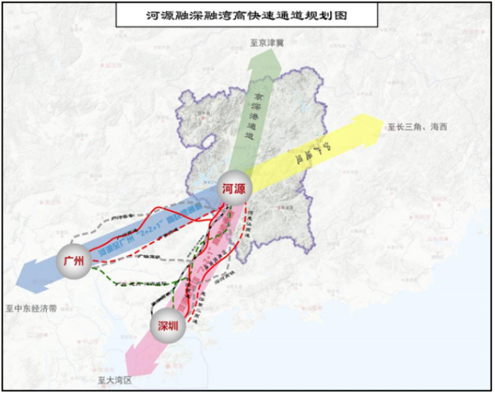 河源到深圳的赣深、深河2条高铁通道,长深、河惠汕-广龙-惠深2条高速公路通道,深圳-惠州-河源1条城际轨道