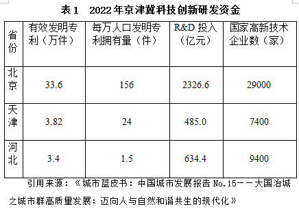 与北京相比,天津和河北在创新能力方面仍存在较大差距,近年来差距进一步扩大,制约了京津冀三地的创新合作空间。从创新投入来看,《2023京津冀将如何推进?》表明,2022年北京研发投入强度达到6.44%,天津和河北研发投入强度分别为3.44%和1.75%,远低于北京的投入水平,河北低于全国平均水平0.65个百分点。自2014年以来,天津和河北与北京之间的差距一直很大。从研发资金的绝对数量来看,2022年差距很大(见表1)。近年来,京津冀三地的金融支持能力进一步扩大,缩小差距变得更加困难。《城市蓝皮书:中国城市发展报告No.15——大国治城之城市群高质量发展:迈向人与自然和谐共生的现代化》中指出,从创新产出来看,2022年,北京专利授予量为16.3万件,分别是河北和天津的1.8倍和2.2倍;有效发明专利33.6万件,分别是河北和天津的9.9倍和8.8倍。以人均人数而言,差距更为明显,北京每万人的发明专利数量大约是河北的10倍。